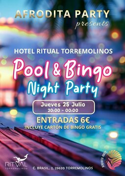 Ven a divertite con Afrodita Party y Hotel Ritual en nuestra exclusiva fiesta nocturna de piscina y bingo el jueves 25 de julio de 20:00 a 00:00.