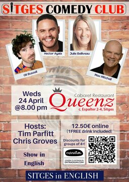 'Sitges Comedy Club' returns for another great show, with regular hosts Tim Parfitt and Chris Groves and the very best comedians from Barcelona and beyond! This month we have local legends Julie Beliveau (New Zealand) Oli Bussell (UK) and Max Mitchell (US) and we are very excited to welcome back Hector Ayala (MEXICO)!!