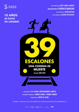 "39 escalones" es una de las comedias más representadas en todo el mundo. Tras más de 10 años de éxito absoluto en Londres, Saga Producciones presenta una nueva adaptación de la delirante parodia de la película de Alfred Hitchcock. Richard Hannay es un soltero canadiense de 39 años que se ve involucrado en una trama de espionaje a raíz de un asesinato que se comete en su apartamento, en el Londres de 1935. A partir de este momento da comienzo una trepidante comedia de persecución en la que Hannay intenta demostrar su inocencia y desbaratar un plan secreto que podría provocar una nueva Guerra Mundial. Una comedia en la que cuatro actores interpretan a un sinfín de personajes y utilizan todos los recursos teatrales a su alcance para hacer partícipe al público de esta aventura tan loca como emocionante.