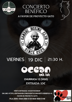 Concierto benéfico a favor del refugio de animales PROYECTO GATO VIGO. La Banda de fusión Gandhi Boxing Club, con una mezcla de estilos muy personal y exquisita, apoya la iniciativa solidaria aportanto su talento musical.