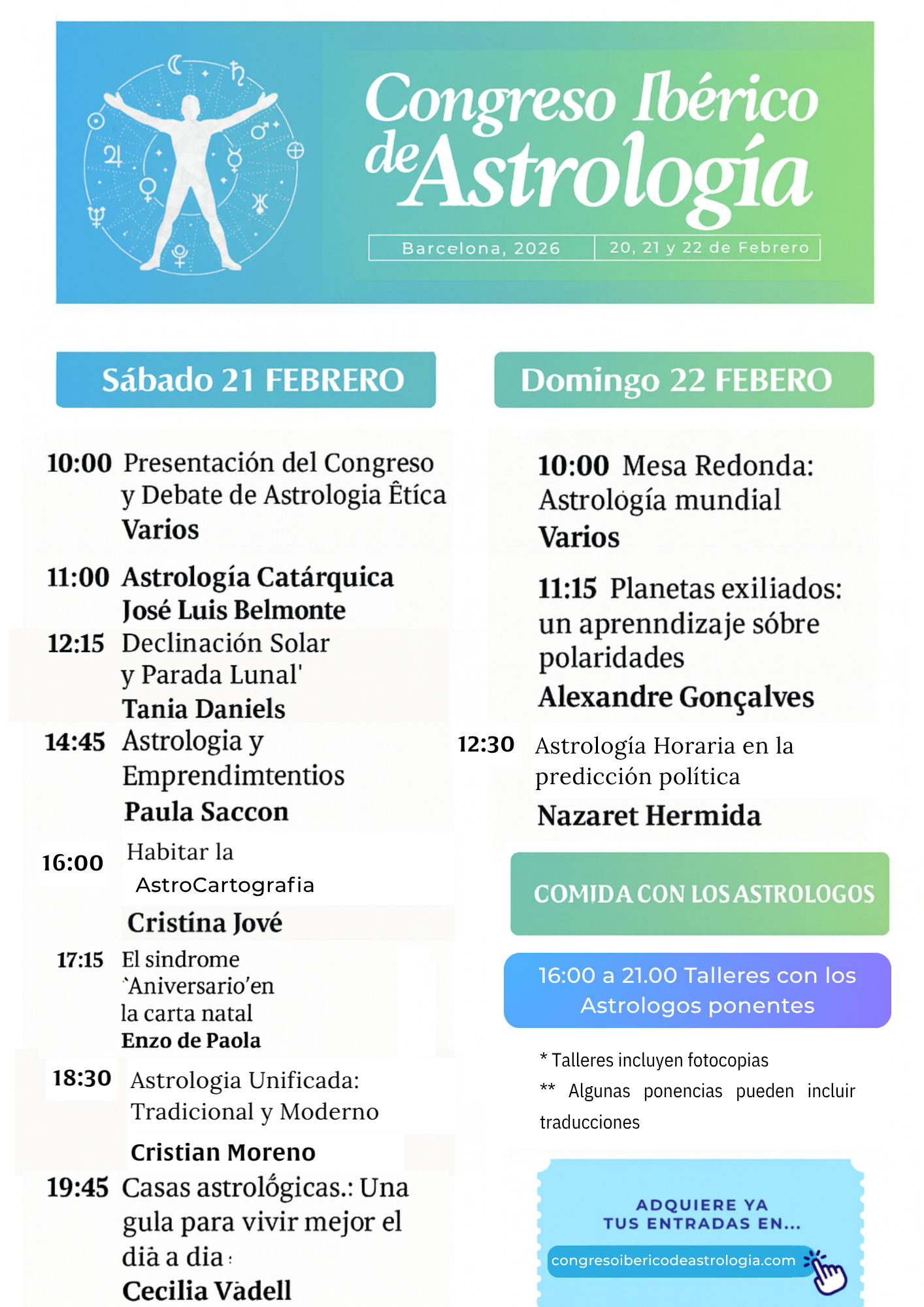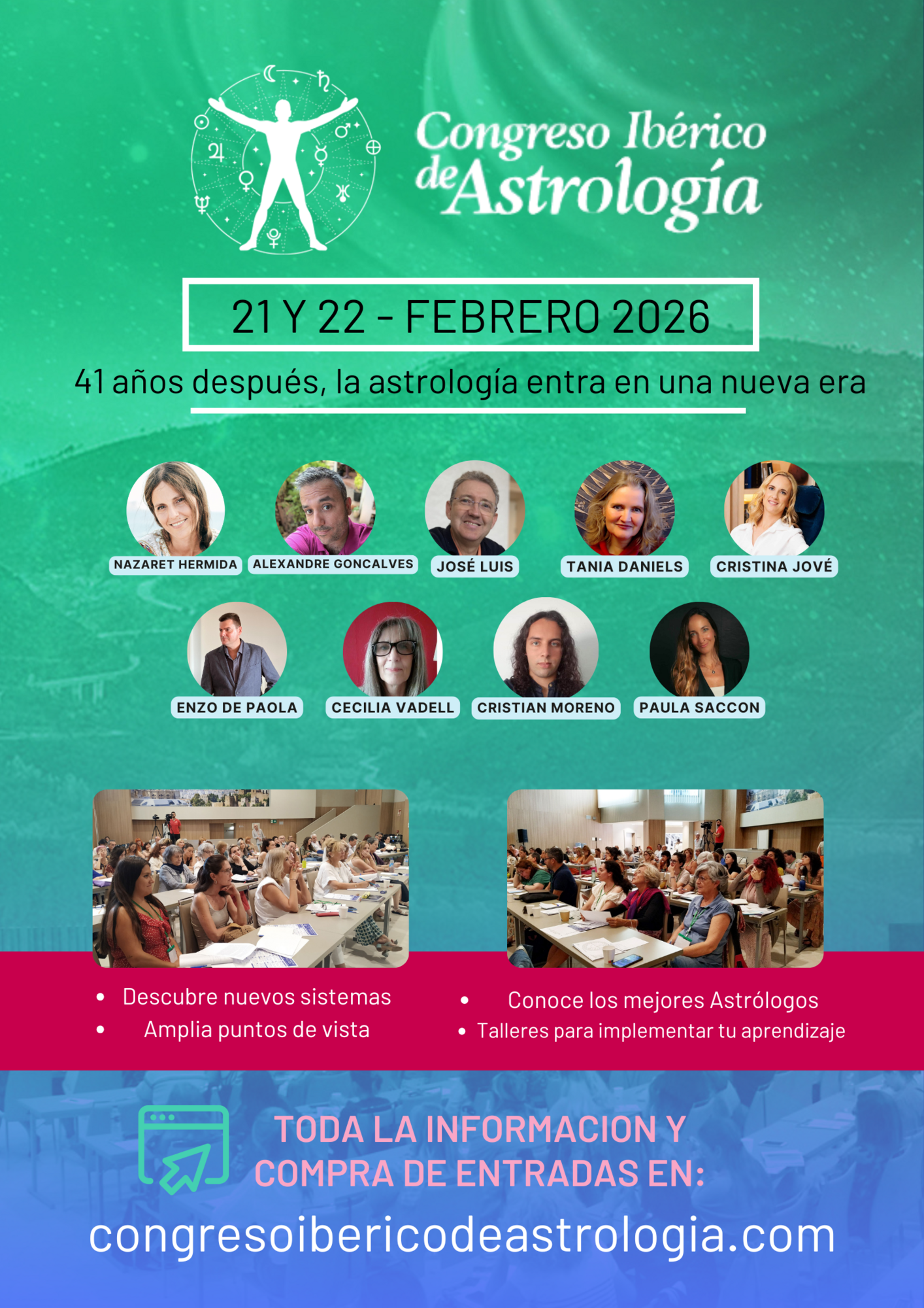 Con más de 41 años de historia y desde una perspectiva renovada para garantizar la ética profesional en el sector, presentamos el CONGRESO IBÉRICO DE ASTROLOGÍA que tendrá lugar en Barecelona en Febrero de 2026. La organizadora, Nazaret Hermida, lleva más de veinte años realizando predicciones políticas acertadas sin excepción y ha colaborado con medios como Telecinco o Revista Semana. En este evento, ha reunido a los mejores profesionales del sector, que llevarán a cabo conferencias de Astrología Tradicional y así mismo haremos debates constructivos entre todos.