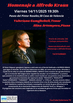 El tenor Internacional Valeriano Gamghebeli ofrecerá el 14.11.2025 Homenaje a su Maestro Alfredo Kraus en la Casa de Valencia en Madrid. V.Gamghebeli es ganador de varios Concursos Internacionales que llevan nombres de insignes tenores: Francisco Viñas, Julian Gayarre, Troyan Grozavescu y ei Premio al mejor tenor de José Carreras .