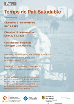 Tota persona amb interés per la millora del temps de pati és benvinguda a la jornada. Aquest primer Fòrum «Temps de pati saludable» de Menorca estarà dedicat a compartir experiències de qualsevol etapa educativa, tant d’escoles públiques com privades o concertades.