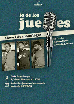 Disfruta de dos de los mejores shows de humor de Valencia: "Lo de los jueves"; con El Carbe e invitados, y "Aún no es finde" con Gracia Hernándis y Alberto La Cruz, en semanas alternas en la sala Cayo Largo de Valencia (Calle Juan Llorens 31).