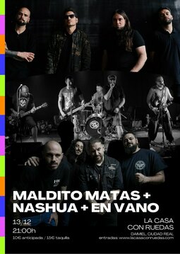 El próximo sábado 13 de diciembre cerraremos el año con una potente noche de punk-rock en La Casa con Ruedas de Daimiel, de la mano de Maldito Matas, presentando su nuevo trabajo "Himnos desde el Infierno", junto a las dos bandas madrileñas Nashua y En Vano, que nos darán buena muestra, con su potente directo, de lo mejor de su repertorio.