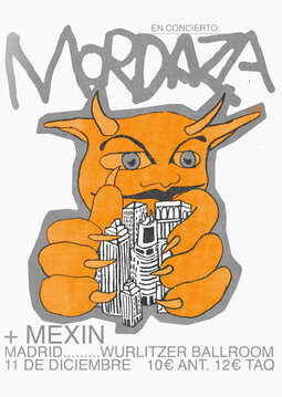 El cuarteto madrileño formado en 2024 conjura todas sus influencias en un vórtice de fuego. Su centro de gravedad pone la contundencia en medio del meollo, pero su espíritu melódico se arraiga hasta el tuétano. Encasillarlos en el post-punk, el noise pop o el punk rock sería vago e inexacto. Mordaza van mucho más allá.