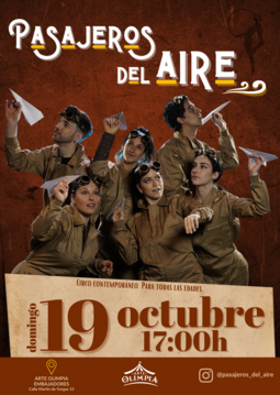 Seis viajeros se embarcan en una travesía por ocho mundos donde todo flota, gira y se transforma. A través de una fusión de danza, teatro físico y acrobacias aéreas y de suelo, cada desafío se convierte en aprendizaje: descubrir valores, tomar rumbos inesperados y levantarse después de cada tropiezo. Pasajeros del aire celebra el amor, la amistad y el respeto, e invita a niñas, niños y personas adultas a mirar su propio mundo con otros ojos. Una aventura visual y emotiva que recuerda que los sueños se alcanzan paso a paso, con coraje y en compañía.