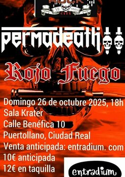 ¡No te pierdas esta oportunidad de ver a la banda madrileña de Rojo Fuego, acompañados por la banda ciudarrealeña Permadeath!