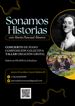 MARÍA PASCUAL ÁLVAREZ crece como artista entre viajes y mudanzas (Canarias, Cádiz, Madrid y Barcelona). Su educación musical culminó oficialmente en la ESMUC con un grado de música clásica y un máster de piano Flamenco. Pero sigue sumando inspiración de allá por donde late su oído. Sus conciertos son fruto de una motivación por crear espacios de encuentro social artísticos para no olvidarnos nunca de que la humanidad vive en el presente y se alimenta. María tiene un estilo musical muy variado fruto de su formación clásica y su posterior especialización en flamenco e improvisación. Tiene un lenguaje despierto por una rica imaginación y sensorialidad.