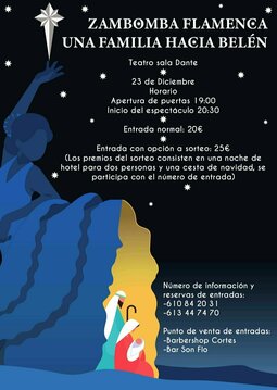 Zambomba flamenca con muchísimos artistas donde será una noche mágica flamenca navideña con más de 20 artistas que participarán en la zambomba. Niños adultos y mayores bienvenidos a una noche mágica inolvidable.