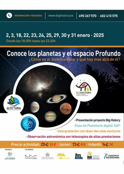 Con esta actividad que hemos preparado, podrás observar en una misma noche Saturno, el planeta más espectacular del Sistema Solar gracias a sus anillos; Júpiter, con sus enigmáticas lunas; Venus, con su forma cambiante y Marte, el planeta rojo. Así mismo, podrás observar un interesante repertorio de objetos que están más allá del Sistema Solar (estrellas dobles, cúmulos de estrellas, nebulosas, galaxias…)