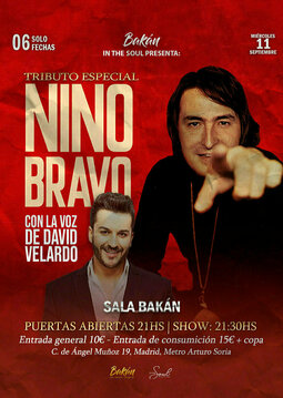 Nino Bravo estaba considerado como la mejor voz del pop nacional a finales de los sesenta y principios de los setenta. Muchos de sus éxitos musicales cruzaron las fronteras. Lleno infinidad de comentarios elogiosos. Triunfo como nunca y se convirtió en un referente. Hoy David Velardo nos propone un show para todos los públicos basado en los mejores éxitos de este valenciano de referencia.